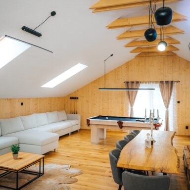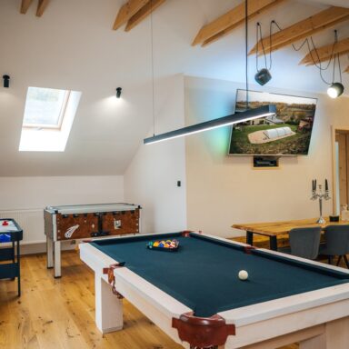 V maštali sa nachádza krb, zariadená kuchyňa, výčap, grill, kebabing, veľký dubový stôl a nízke posedenie.