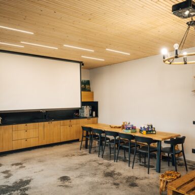 Nechýba ani veľké premietacie plátno s projektorom, domácim kinom, WiFi.