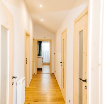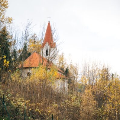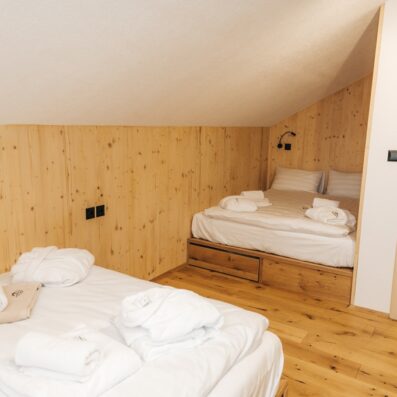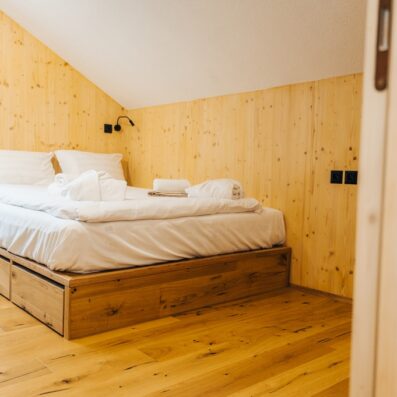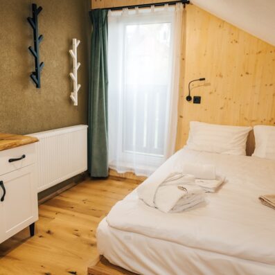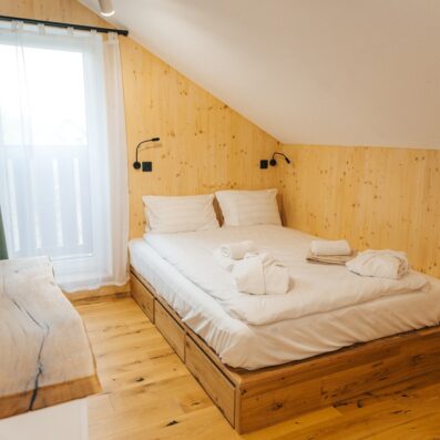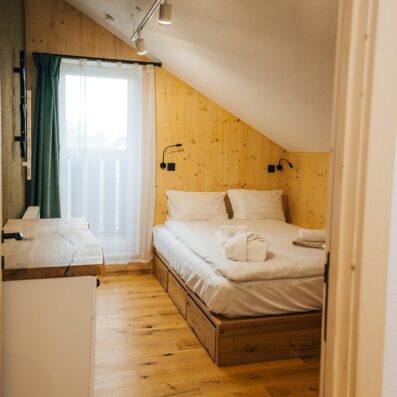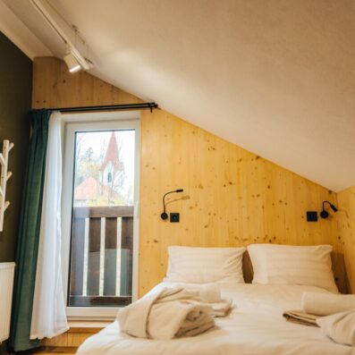 V izbe sa nachádzajú dve manželské postele s komodou a výhľadom na kostol a Tatry.