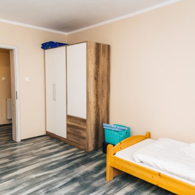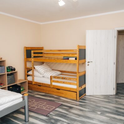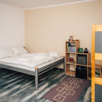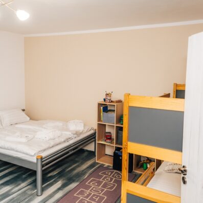 Pozostáva z manželskej postele, poschodovej postele a lôžkovej postele izba je s výhľadom na kostol.