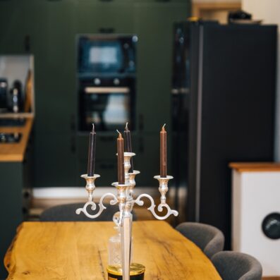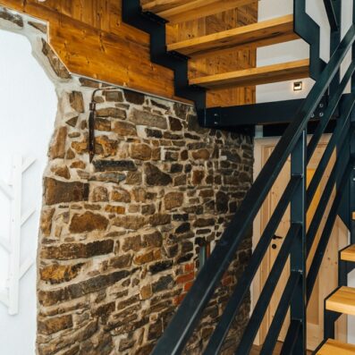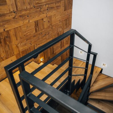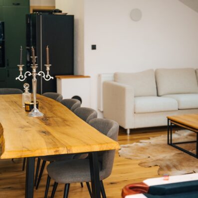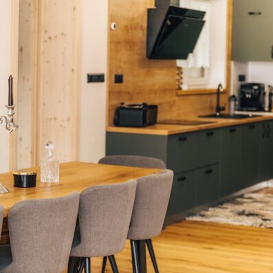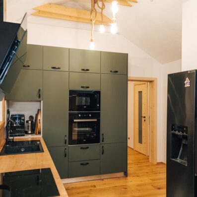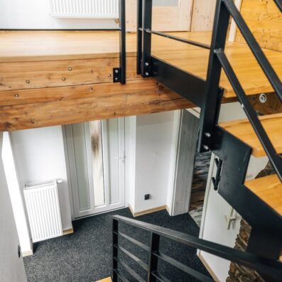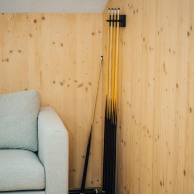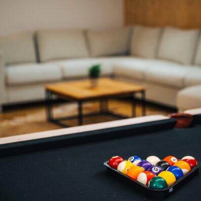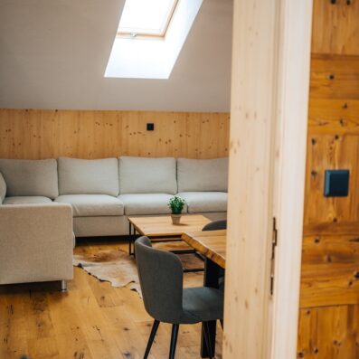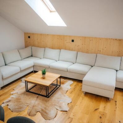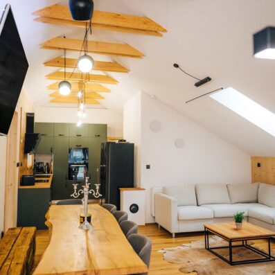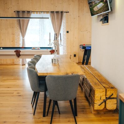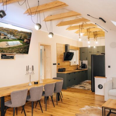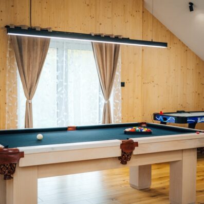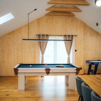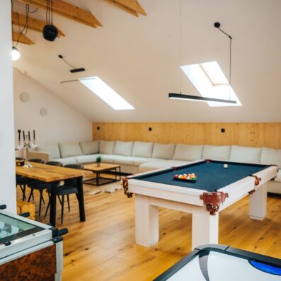 Na poschodí nájdete taktiež kúpeľňu so sprchovým kútom spojenú s WC, jedno samostatné wc, priestrannú obývaciu spoločenskú miestnosť, v ktorej sa nachádza biliard, stolný futbal, air hockey, televízia, playStation. Súčasťou tejto izby je veľký dubový stôl. Táto spoločenská miestnosť je prepojená s plne zariadenou kuchyňou pozostávajucej z mikrovlnkou, elektrickou rúrou, umývačkou riadu, kávovarom, chladničkou s zmrazničkou a výrobníkom ľadu, rýchlovarná kanvica, toustovač a hriankovač, indukčná varná doska.